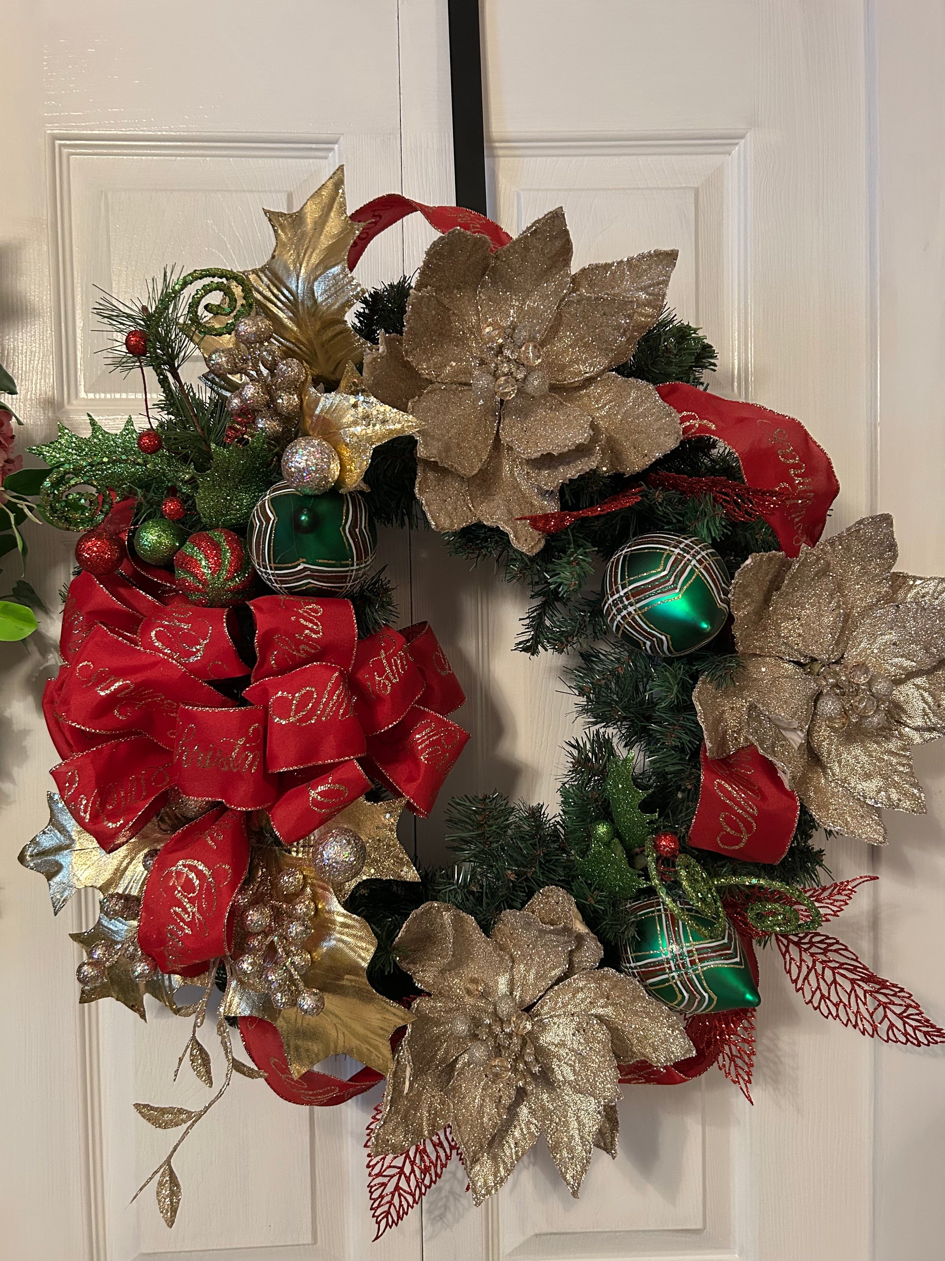 Bring timeless holiday elegance to your home with this stunning Christmas wreath. Lush evergreen branches form the base, beautifully adorned with sparkling gold poinsettias, rich red ribbon inscribed with “Merry Christmas,” and shimmering gold holly leaves. Classic green and red ornaments, glittering baubles, and whimsical swirls add playful touches, while the bold layered bow ties the design together with festive charm. Perfect for a front door, mantel, or entryway, this handcrafted wreath captures the warmth and joy of the holiday season with luxurious detail and traditional Christmas colors.